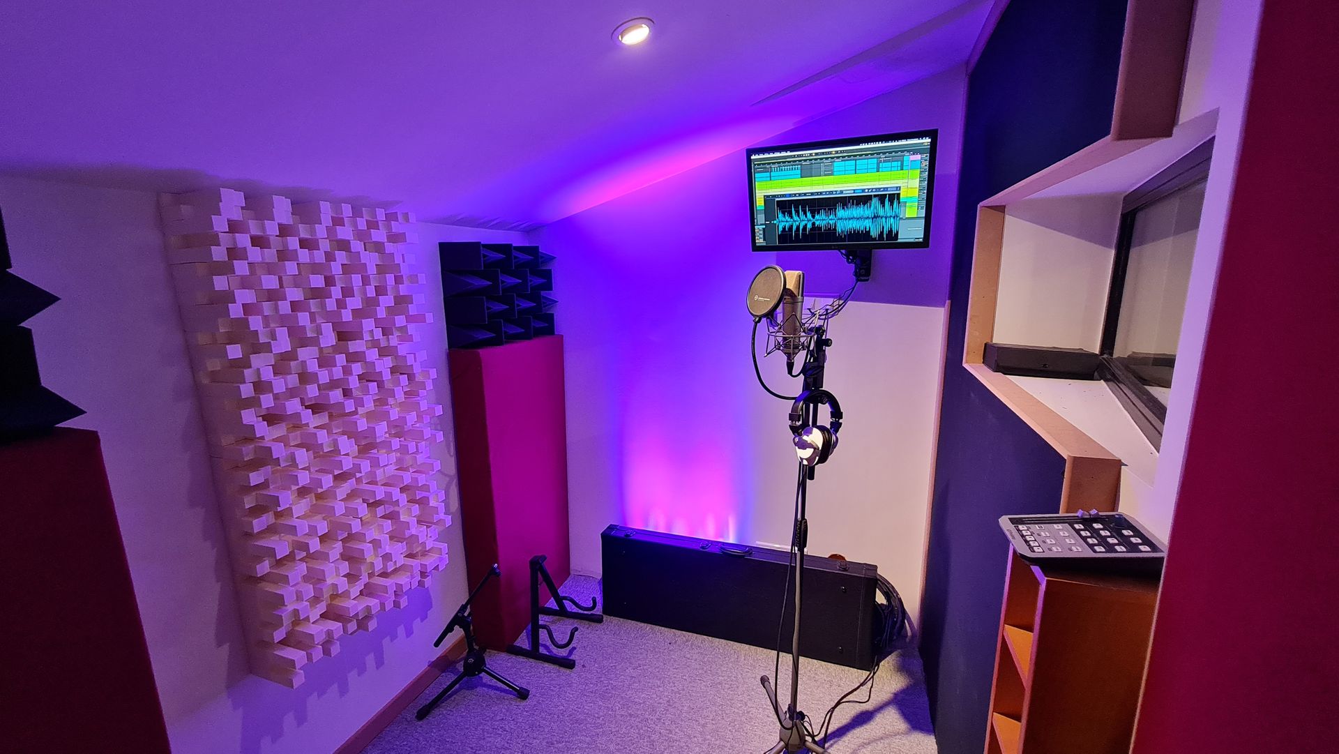 Le studio offre des services d'enregistrement pour vos instruments et vos voix dans des cabines séparées. Ces cabines sont équipées d'un contrôle de régie à distance, d'un traitement acoustique, d'une vitre donnant sur la salle de contrôle et d'un écran pour afficher vos textes, vidéos, images ou pour vous guider sur le placement de la voix.